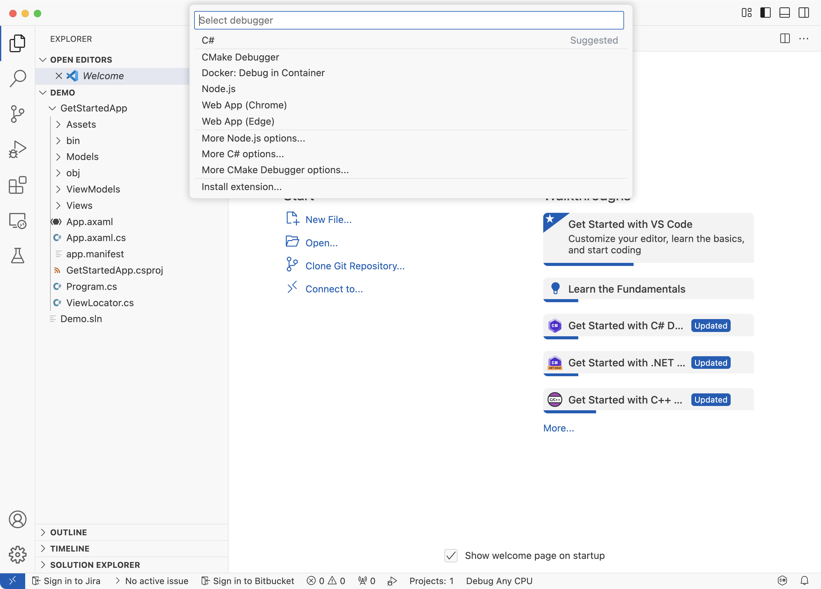 - Select C#: GetStartedApp Demo to launch the application with the debugger connected.
