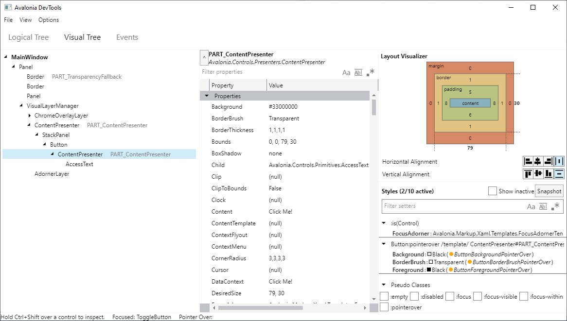 Une partie essentielle de la gestion de la fonctionnalité de l'application effectuée par Avalonia UI est la génération et la propagation des événements. L'onglet Événements enregistre la source et la propagation des événements au fur et à mesure que vous vous déplacez et interagissez avec l'application en cours d'exécution.