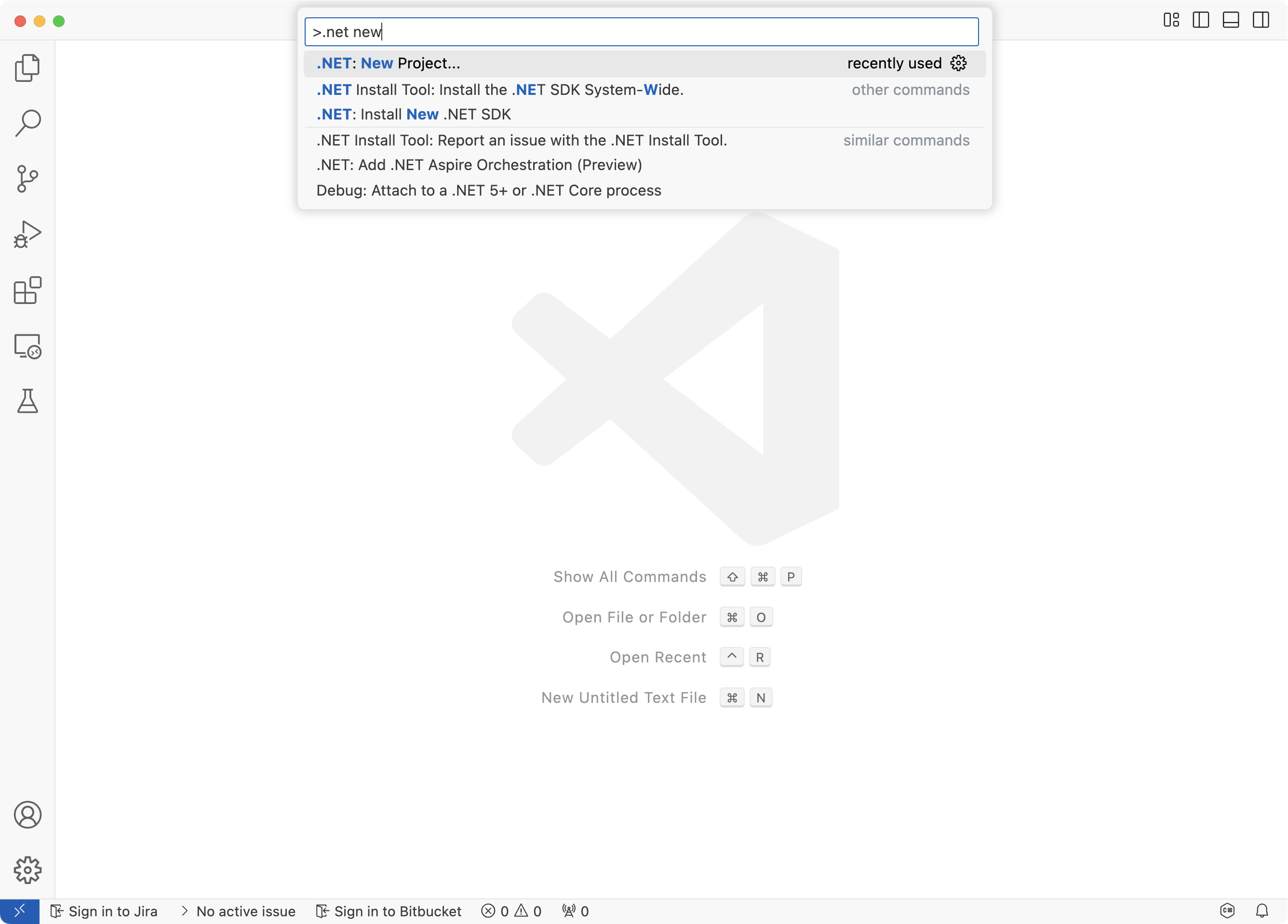 ⇧ ⌘ P, puis tapez ".NET" et trouvez et sélectionnez la commande .NET : Nouveau projet.