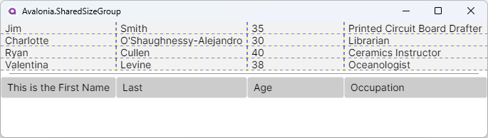 The following example demonstrates how SharedSizeGroup can be used to consistently size columns within a ListBox and outside.