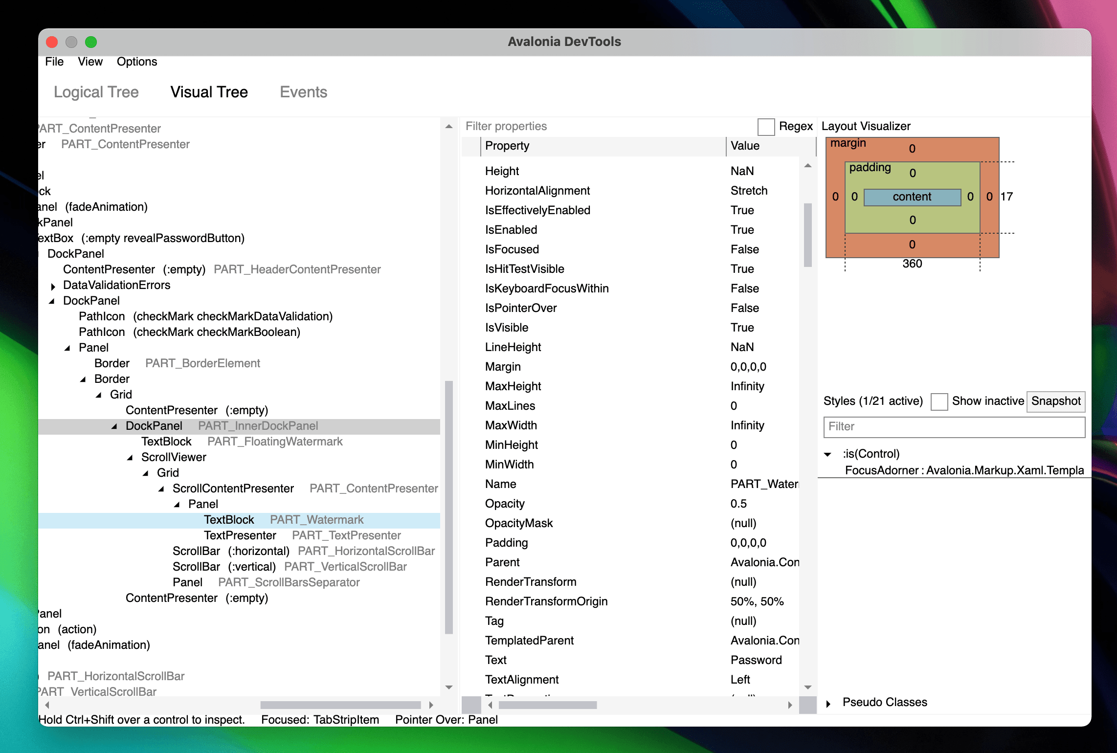 The Logical Tree and Visual Tree tabs display the controls in the window's logical and visual trees. Selecting a control will show the properties of that control in the right-hand pane where they can be edited.