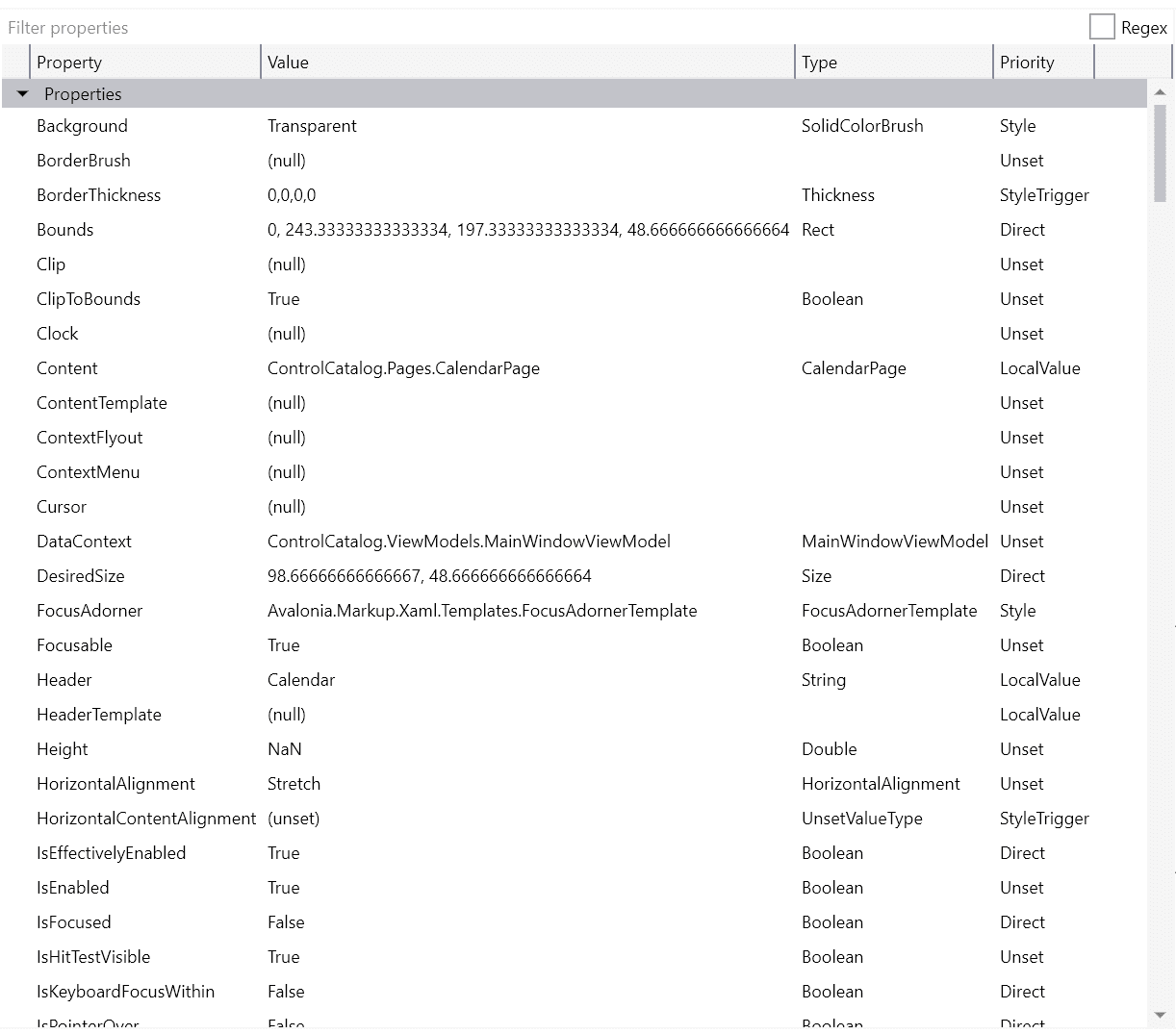 Allows for quickly checking and editing properties of the control. One can also search for properties (by name or by using a regex).