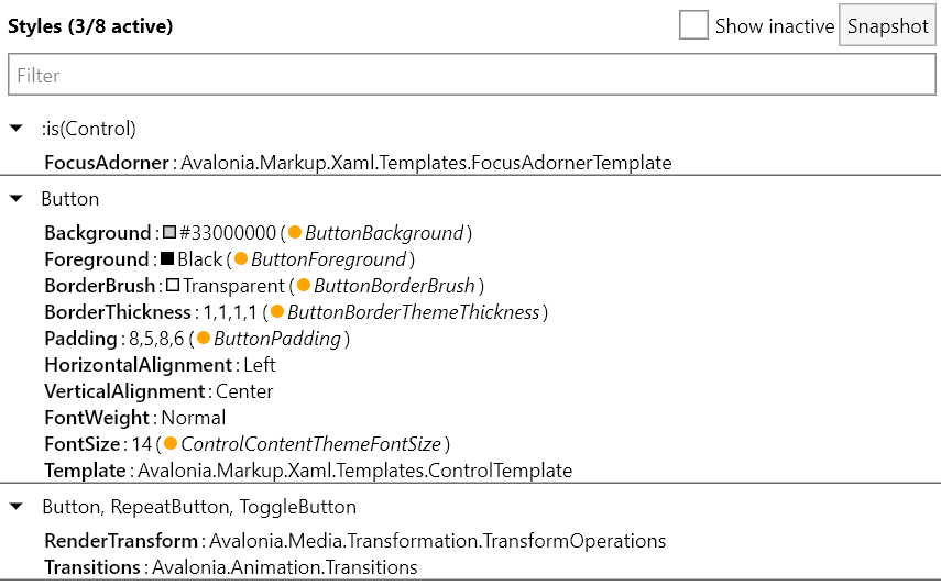 Current styles can be snap-shotted by either pressing the Snapshot button or pressing Alt+S while hovering over the target window. Snap-shotting means that styles panel won't update to reflect new state of the control. This is especially useful when troubleshooting problems with :pointerover or :pressed selectors.